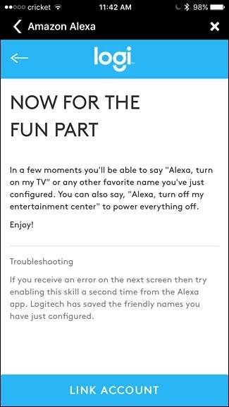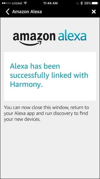 จากนั้นคุณจะได้รับคำยืนยันว่า Alexa เชื่อมโยงกับ Harmony สำเร็จแล้ว จากที่นี่คุณสามารถปิดแอพและเริ่มใช้ Echo หรืออุปกรณ์อื่น ๆ ที่รองรับ Alexa เพื่อควบคุมระบบความบันเทิงภายในบ้านของคุณ