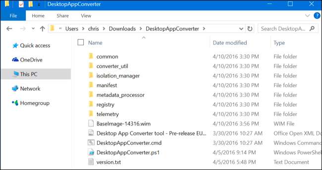 สมมติว่าคุณใช้ Windows 10 Insider Preview รุ่นใหม่เพียงพอคุณสามารถดาวน์โหลดและติดตั้งไฟล์ โปรแกรมแปลงแอปเดสก์ท็อป จากไซต์นักพัฒนาของ Microsoft ดาวน์โหลดทั้งไฟล์ DesktopAppConverter.zip และ BaseImage-14316.wim แตกไฟล์ DesktopAppConverter.zip ที่ดาวน์โหลดมาไปยังโฟลเดอร์บนคอมพิวเตอร์ของคุณและวางไฟล์ BaseImage ในไดเร็กทอรีเดียวกัน (หากมี Windows 10 รุ่นใหม่ให้ใช้งานคุณควรเห็นไฟล์ BaseImage ใหม่คุณจะต้องใช้ไฟล์ BaseImage ที่มีหมายเลขเวอร์ชันเดียวกับรุ่นที่ติดตั้งของ Windows 10)