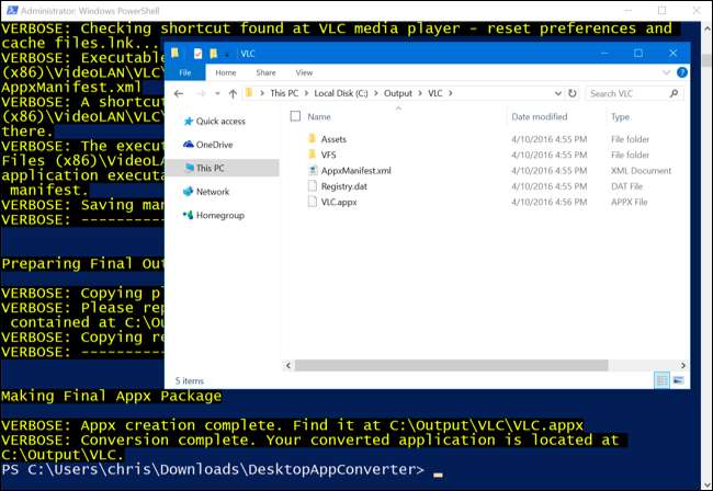 . \ DesktopAppConverter.ps1 -ExpandedBaseImage C: \ ProgramData \ Microsoft \ Windows \ Images \ BaseImage-14316 - โปรแกรมติดตั้ง C: \ Users \ chris \ Downloads \ vlc \ vlc-2.2.2-win32.exe -InstallerArguments "/ S" - ปลายทาง C: \ Output \ VLC -PackageName "VLC" -Publisher "CN = VideoLAN" -Version 0.2.2.2 -MakeAppx -Verbose