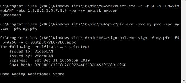 เพียงเปิดหน้าต่างพรอมต์คำสั่งในฐานะผู้ดูแลระบบและเรียกใช้คำสั่งต่อไปนี้เพื่อสร้างใบรับรองที่เซ็นชื่อด้วยตนเองและลงนามในแพ็คเกจ. appx ด้วย: