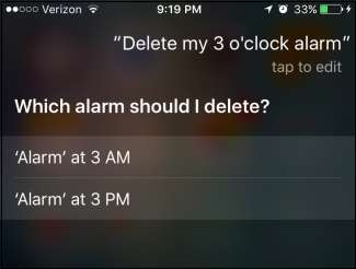 แน่นอนคุณสามารถระบุคำขอให้เจาะจงมากขึ้นได้โดยพูดว่า“ ลบนาฬิกาปลุก 03:00 ของฉัน” เมื่อ Siri สามารถระบุการปลุกที่คุณหมายถึงได้อย่างแน่นอนเธอก็จะลบออกโดยไม่ต้องมีการยืนยันใด ๆ