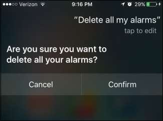 คุณยังสามารถบอกให้ Siri ลบการเตือนทั้งหมดในโทรศัพท์ของคุณได้โดยพูดว่า“ ลบการปลุกทั้งหมดของฉัน” ในกรณีนี้ Siri จะขอให้คุณยืนยันการเลือกของคุณ บอก Siri ว่า“ ยืนยัน” หรือแตะปุ่มยืนยัน
