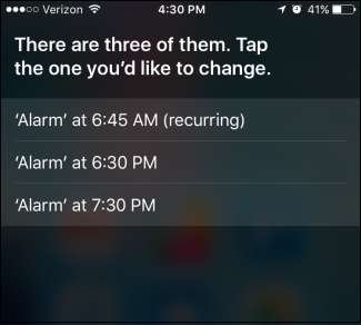 อีกครั้งจะช่วยให้เฉพาะเจาะจงมากที่สุด หาก Siri ไม่สามารถระบุสัญญาณเตือนที่คุณอ้างถึงได้อย่างถูกต้องหรือหากคุณใช้คำสั่งเช่น“ เปลี่ยนการเตือนของฉัน” Siri จะแสดงรายการการเตือนที่เป็นไปได้และขอให้คุณยืนยันว่าต้องการเปลี่ยนการปลุกใดโดยแตะ มัน.