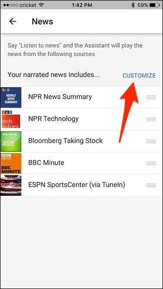 คุณจะเห็นรายชื่อแหล่งข่าวปัจจุบันที่ Google Home ใช้ แต่การแตะที่“ ปรับแต่ง” จะทำให้คุณสามารถเปลี่ยนแปลงได้