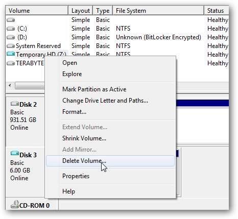 ใน Computer Management ให้ไปที่ Disk Management คลิกขวาที่ VHD ที่คุณต้องการกำจัดและเลือก Delete Volume