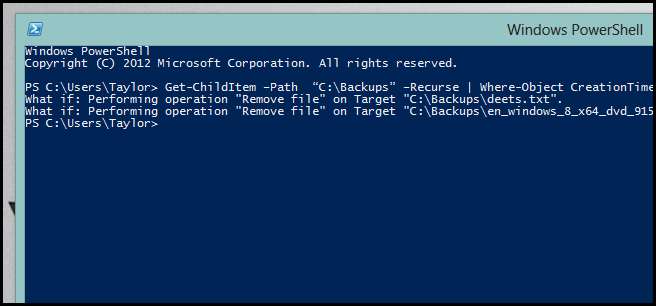 Get-ChildItem - เส้นทาง“ C: \ Backups” –Recurse | Where-Object CreationTime –lt (Get-Date) .AddDays (-5) | ลบรายการ - WhatIf