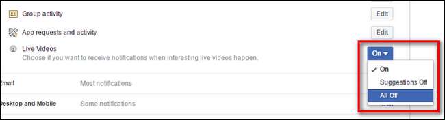 เลื่อนลงในเมนูการแจ้งเตือนที่ค่อนข้างยาวจนกว่าคุณจะเห็น“ วิดีโอสด” ที่ด้านล่าง คลิกที่ช่องแบบเลื่อนลงข้าง“ วิดีโอสด” และเปลี่ยนค่าเริ่มต้น“ เปิด” เป็น“ ปิดทั้งหมด”