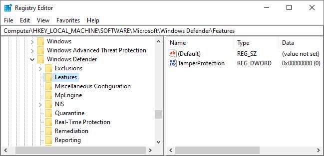 HKEY_LOCAL_MACHINE \ SOFTWARE \ Microsoft \ Windows Defender \ Features