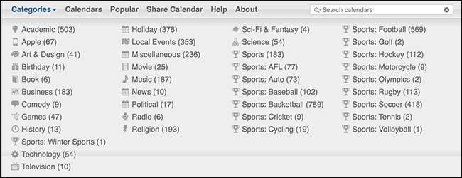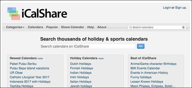 iCalShare เป็นเว็บไซต์ที่มีปฏิทินหลายพันรายการที่คุณสามารถสมัครสมาชิกได้ โดยเน้นที่วันหยุดประจำชาติและการแข่งขันกีฬาเป็นหลัก แต่คุณสามารถค้นหาปฏิทินสำหรับทุกอย่าง เกม Xbox ออก ถึง กำหนดการเปิดตัวของ NASA . คุณสามารถสมัครสมาชิกได้ด้วยแอปปฏิทินที่คุณชื่นชอบเช่น Google ปฏิทินหรือ iCal และไม่ต้องกังวลกับการเพิ่มกิจกรรมเหล่านั้นด้วยตนเอง