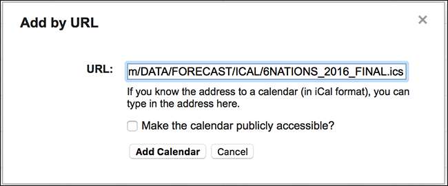 วางลิงก์ที่คุณคัดลอกจาก iCalShare ลงในกล่องโต้ตอบแล้วคลิกเพิ่มปฏิทิน