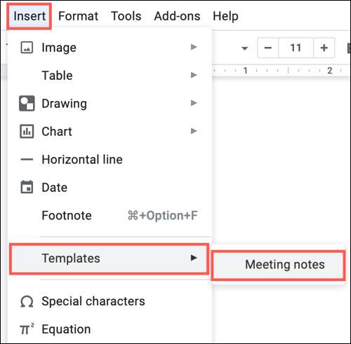 ไปที่จุดในเอกสารของคุณที่คุณต้องการเพิ่มบันทึกการประชุม คลิกแทรก & GT; เทมเพลตจากแถบเมนูและเลือก "บันทึกการประชุม"