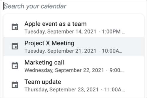 คุณจะเห็นรายการแบบหล่นลงของเหตุการณ์ที่แนะนำจากคุณ Google ปฏิทิน . เลือกการประชุมหรือใช้กล่องค้นหาหากคุณมีจำนวนมาก