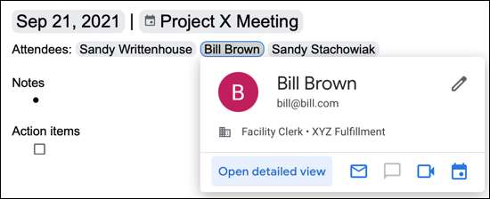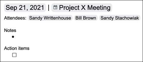 และเช่นนั้นเทมเพลตโน้ตการประชุมจะปรากฏในเอกสารของคุณ คุณจะเห็นวันที่ชื่อและ ผู้เข้าร่วมประชุมเป็นชิปสมาร์ท . คุณสามารถคลิกเดียวเพื่อดูรายละเอียดเพิ่มเติม