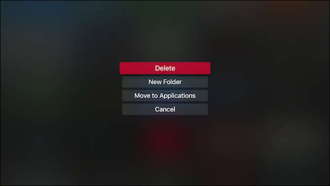 ขั้นแรกเลือกแอพที่คุณต้องการย้ายไปไว้ในโฟลเดอร์ คลิกพื้นผิวระบบสัมผัสบนรีโมท Siri ค้างไว้ (ในรีโมทรุ่นเก่าให้กด Select ค้างไว้) จนกระทั่งแอปเริ่มกระตุก