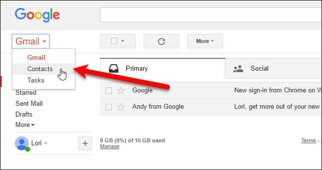 เมื่อคุณพร้อมที่จะนำเข้ารายชื่อติดต่อไปยัง Gmail ให้เปิดเบราว์เซอร์และลงชื่อเข้าใช้บัญชีของคุณ จากนั้นคลิกที่ "Gmail" และเลือก "ผู้ติดต่อ" จากเมนูแบบเลื่อนลง