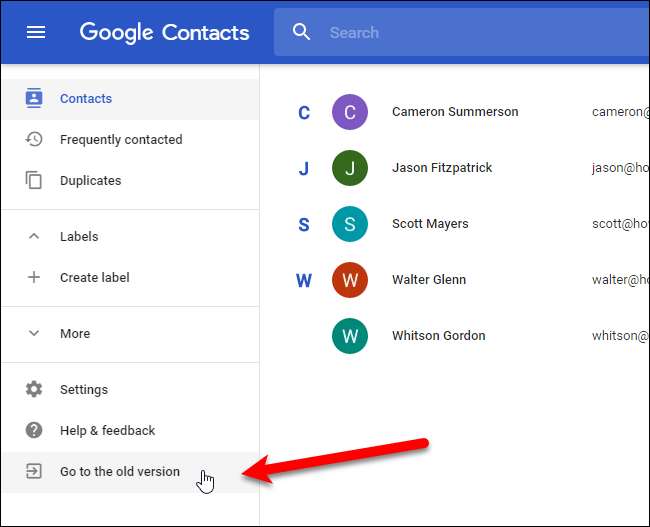 Google กำลังออกแบบรายชื่อติดต่อใหม่และคุณสามารถลองดูตัวอย่างรายชื่อติดต่อได้ (คลิกที่“ ลองดูตัวอย่างรายชื่อติดต่อ” ในเมนูทางด้านซ้ายเมื่อดูรายชื่อติดต่อในเวอร์ชันเก่า) อย่างไรก็ตามตัวอย่างรายชื่อติดต่อยังไม่อนุญาตให้คุณส่งออกรายชื่อติดต่อดังนั้นเราจึงต้องเปลี่ยนกลับเป็นเวอร์ชันเก่าเพื่อส่งออกรายชื่อ โดยคลิก“ ไปที่เวอร์ชันเก่า” ที่ด้านล่างของรายการตัวเลือกทางด้านซ้าย