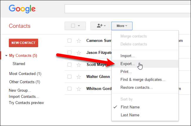 เมื่อคุณกลับมาใช้ Google Contacts เวอร์ชันเก่าแล้วให้คลิก“ เพิ่มเติม” ที่ด้านบนของหน้าแล้วเลือก“ ส่งออก” จากเมนูแบบเลื่อนลง