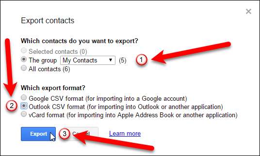 ข้อสังเกตคุณสามารถส่งออกกลุ่มรายชื่อที่เลือกหรือรายชื่อติดต่อทั้งหมดของคุณเป็นรูปแบบหนึ่งในสามรูปแบบ รูปแบบการส่งออกควรเป็น Outlook .CSV (CSV = Comma Separated Values ซึ่งหมายความว่าแต่ละฟิลด์ [Name, Address, Phone, etc.] ถูกคั่นด้วยไฟล์ลูกน้ำ) เลือกผู้ติดต่อที่คุณต้องการส่งออกจากนั้นเลือกตัวเลือก“ รูปแบบ Outlook CSV”