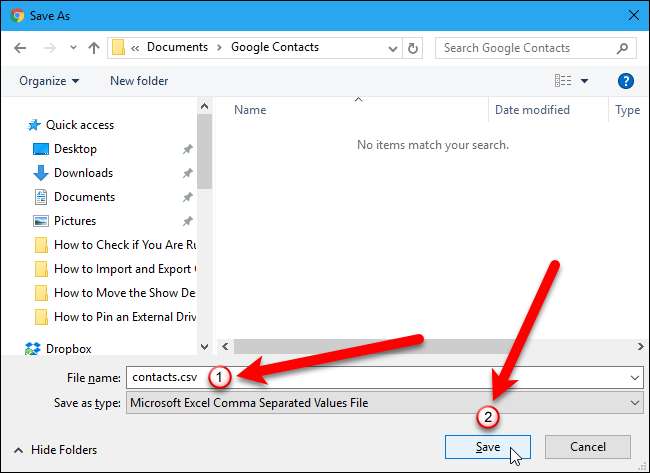 ในกล่องโต้ตอบบันทึกเป็นนำทางไปยังตำแหน่งที่คุณต้องการบันทึกไฟล์ CSV ของผู้ติดต่อของคุณ โดยค่าเริ่มต้น contacts.csv จะถูกป้อนในช่อง "ชื่อไฟล์" เพื่อเป็นคำแนะนำสำหรับชื่อ แต่คุณสามารถเปลี่ยนได้หากต้องการ จากนั้นคลิกปุ่ม "บันทึก"
