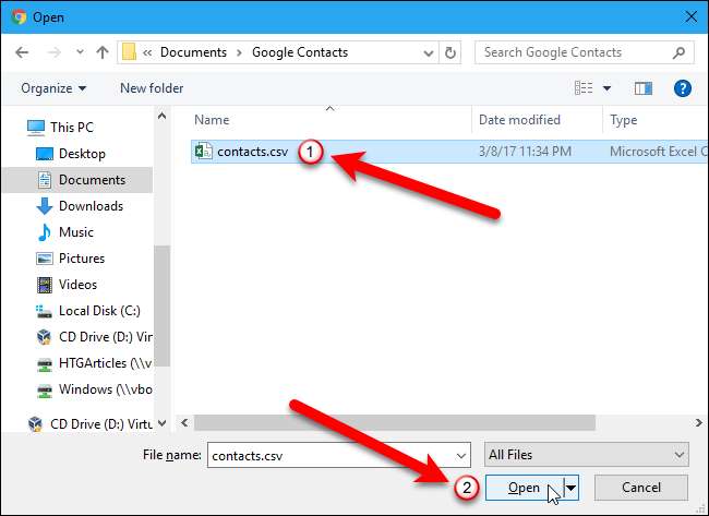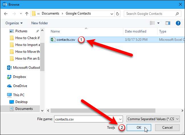 ในกล่องโต้ตอบเปิดให้ไปที่โฟลเดอร์ที่คุณบันทึกไฟล์. csv จาก Outlook เลือกไฟล์จากนั้นคลิกปุ่ม "เปิด"
