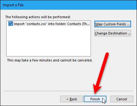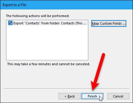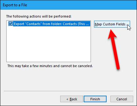 หน้าจอสุดท้ายในกล่องโต้ตอบส่งออกไปยังไฟล์จะแสดงให้คุณเห็นว่ากำลังจะเกิดอะไรขึ้น (“ ส่งออก ‘ผู้ติดต่อ’ จากโฟลเดอร์: ผู้ติดต่อ”) และมอบโอกาสในการแมปช่องแบบกำหนดเองที่คุณอาจสร้างไว้ใน Outlook