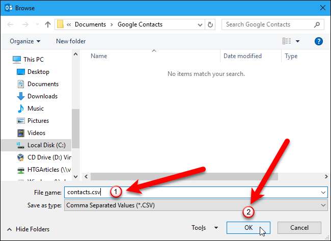 ในกล่องโต้ตอบเรียกดูให้ไปที่โฟลเดอร์ที่คุณต้องการบันทึกไฟล์. csv ชื่อเริ่มต้นของไฟล์ในช่อง“ ชื่อไฟล์” คือ contacts.csv แต่คุณสามารถเปลี่ยนได้หากต้องการ คลิกปุ่ม“ ตกลง” เพื่อเลือกไฟล์ที่จะนำเข้า