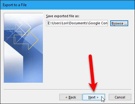 เลือก“ ผู้ติดต่อ” ในกล่องเลือกโฟลเดอร์ที่จะส่งออกจากใต้บัญชีอีเมลที่ผู้ติดต่อของคุณอยู่ จากนั้นคลิกปุ่ม“ ถัดไป”