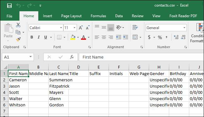 เมื่อการส่งออกเสร็จสิ้นคุณสามารถเปิดไฟล์. csv ที่ส่งออกใน Excel และจัดการไฟล์ที่คุณต้องการได้โดยเพิ่มที่อยู่หมายเลขโทรศัพท์ที่อยู่อีเมลและข้อมูลอื่น ๆ ที่จะช่วยในการปัดเศษสมุดที่อยู่ของคุณ แม้ว่านี่จะเป็นขั้นตอนที่ไม่บังคับ แต่ก็เป็นเรื่องดีที่สามารถดำเนินการต่อไปได้และทำให้ผู้ติดต่อของคุณเรียบร้อยและสม่ำเสมอ