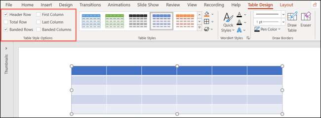 เริ่มต้นที่ด้านซ้ายของริบบิ้นคุณจะเห็นตัวเลือกสไตล์ตาราง หากคุณเห็นการจัดรูปแบบที่กล่าวถึงเมื่อคุณแทรกตารางนี่คือที่ที่ทุกอย่างเริ่มขึ้น ดังนั้นคุณอาจเห็นตัวเลือกแถวส่วนหัวและเรียงลำดับแถวแถบ