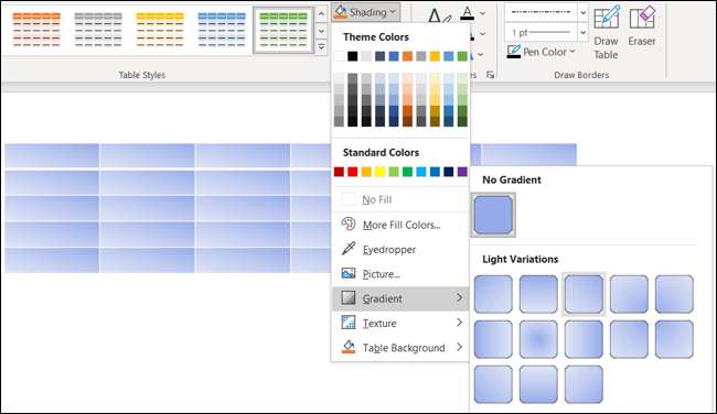 การแรเงาช่วยให้คุณใช้การไล่ระดับสีพื้นผิวรูปภาพหรือพื้นหลังตาราง สิ่งนี้สามารถให้ตารางของคุณดูเป็นเอกลักษณ์หรือเหมาะกับงานนำเสนอของคุณ