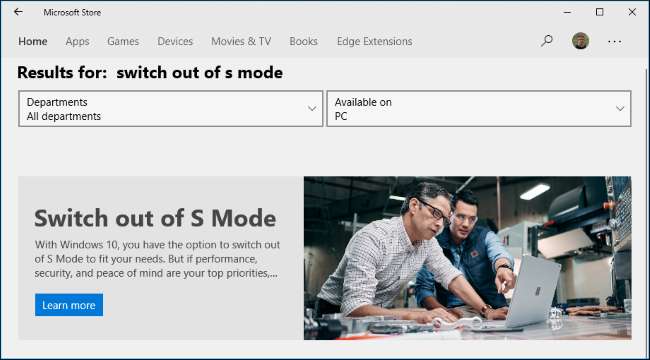 คุณจะเห็นแบนเนอร์“ Switch Out of S Mode” ที่นี่ คลิก“ เรียนรู้เพิ่มเติม” จากนั้น Store จะแนะนำคุณตลอดขั้นตอนการออกจากโหมด S ขั้นตอนนี้จะใช้เวลาเพียงไม่กี่คลิก