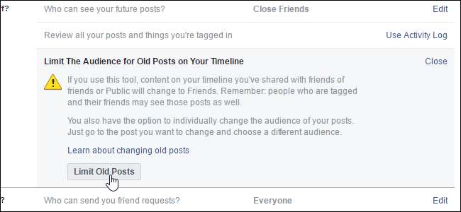อย่างไรก็ตามมีการตั้งค่าที่เปลี่ยนโพสต์ในอดีตทั้งหมดของคุณหรืออย่างน้อยโพสต์ "สาธารณะ" หรือ "เพื่อนของเพื่อน" ในอดีตของคุณให้เป็น "เพื่อน" ได้ในคลิกเดียว หากต้องการเปลี่ยนการตั้งค่านี้ให้เข้าไปที่บัญชี Facebook ของคุณในเว็บเบราว์เซอร์และคลิกลูกศรลงถัดจากปุ่มทางลัดความเป็นส่วนตัวบนแถบเครื่องมือที่มุมขวาบนของหน้าต่างเบราว์เซอร์ คลิก "การตั้งค่า" ในเมนูแบบเลื่อนลง