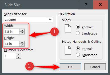หน้าต่างขนาดสไลด์จะปรากฏขึ้น ปรับขนาดของความกว้างและความสูงโดยคลิกที่ลูกศรขึ้นและลงไปทางขวาของแต่ละกล่อง โปรดทราบว่า "สไลด์ขนาดสำหรับ" จะเปลี่ยนเป็น "กำหนดเอง" โดยอัตโนมัติเมื่อคุณแก้ไขมิติ