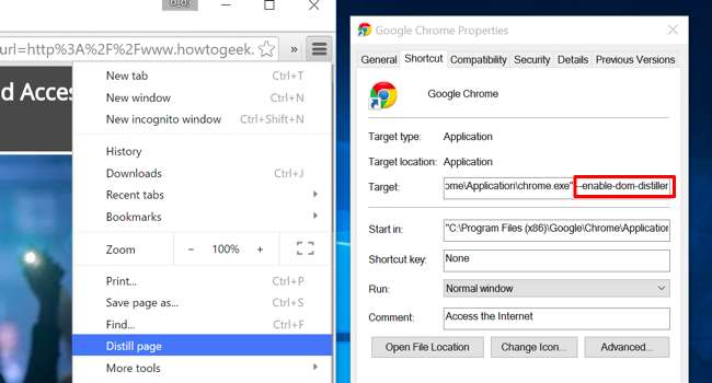 หลังจากนั้นให้ออกจาก Chrome และเปิดใช้งานใหม่โดยใช้ทางลัดนั้น จากนั้นคุณสามารถคลิกปุ่มเมนูและเลือก“ Distill Page” เพื่อเปิดใช้งานโหมดการอ่าน Google อาจลบคุณลักษณะนี้ได้ทุกเมื่อโดยปกติแล้วจะใช้โหมดการอ่านที่เหมาะสมตามค่าเริ่มต้น