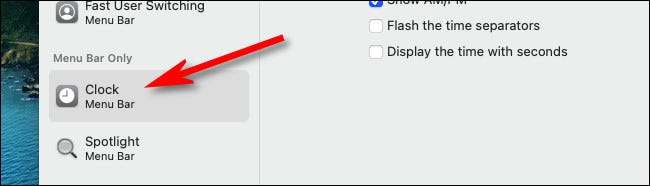 หากคุณใช้ Catalina หรือก่อนหน้านี้ให้คลิกแท็บ "นาฬิกา" ใน "วันที่ & amp; เวลา "การตั้งค่า ใน Big Sur หรือใหม่กว่าให้เลื่อนลง "Dock & AMP; เมนูแถบเมนู "แถบด้านข้างและคลิก" "