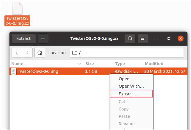 ดาวน์โหลดรุ่นราสเบอร์รี่ Pi ของ Twister OS จาก Twister OS หน้าดาวน์โหลด . ค้นหาไฟล์ที่ดาวน์โหลดมาและคลิกขวา เลือก“เปิดด้วย Archive Manager” จากเมนูบริบท ถ้าตัวเลือกที่ไม่ปรากฏให้เลือก“เปิดด้วยแอพลิเคชันอื่น ๆ” ตัวเลือกและเลือกจัดการแฟ้มจัดเก็บจากที่นั่น