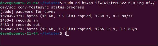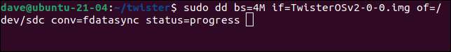 sudo DD BS = 4M ถ้า = TwisterOSv2-0-0.img ของ = / dev / SDC แปลง = fdatasync สถานะความคืบหน้า =