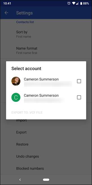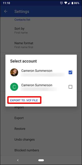 เลือกบัญชีที่คุณต้องการส่งออก (หากคุณมีมากกว่าหนึ่งบัญชี) จากนั้นแตะปุ่ม“ ส่งออกเป็นไฟล์. VCF”