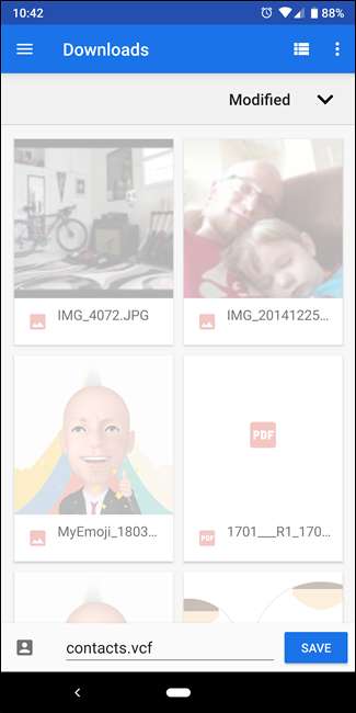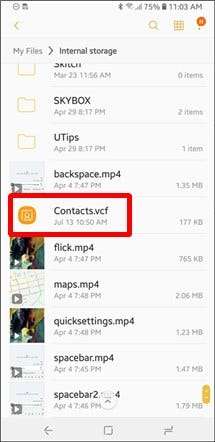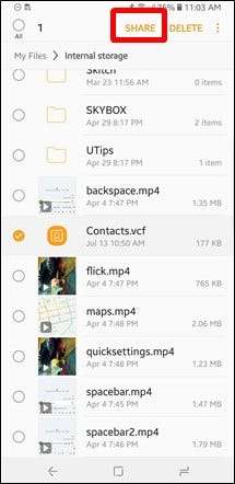 ไฟล์ที่ส่งออก (contacts.vcf) จะถูกบันทึกลงในรูทของตำแหน่งที่เลือก คุณสามารถใช้แอป My Files ของ Samsung เพื่อค้นหาไฟล์ contacts.vcf เมื่อคุณทำเช่นนั้นให้กดค้างไว้จากนั้นเลือกคำสั่ง“ แบ่งปัน”