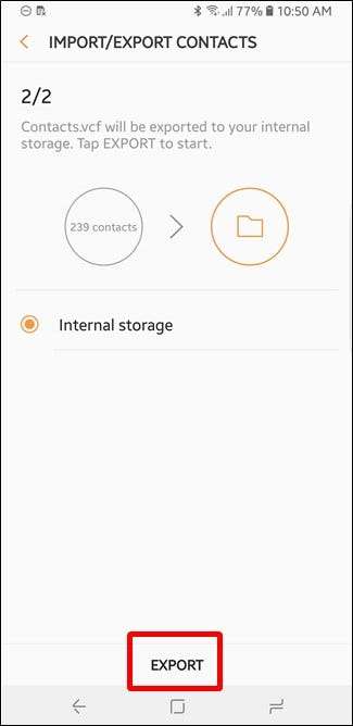 คุณมีทางเลือกเดียวสำหรับสถานที่ส่งออกที่นี่: Internal Storage (แม้ว่าอาจแสดงการ์ด SD ด้วย) ซึ่งหมายความว่าหากคุณต้องการจัดเก็บข้อมูลสำรองของคุณในระบบคลาวด์คุณจะต้องดำเนินการด้วยตนเองหลังจากข้อเท็จจริง ไปข้างหน้าและแตะตำแหน่งส่งออกของคุณจากนั้นกดปุ่ม "ส่งออก" ที่ด้านล่าง