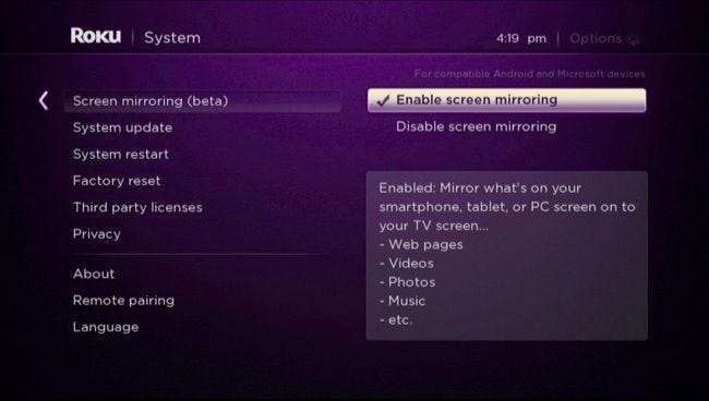 ในการเปิดใช้งานคุณสมบัตินี้ให้ไปที่หน้าจอการตั้งค่าของ Roku เลือกระบบและเลือกการสะท้อนหน้าจอ (เบต้า) ตรวจสอบให้แน่ใจว่าได้เลือกตัวเลือก“ เปิดใช้งานการสะท้อนหน้าจอ” แล้ว