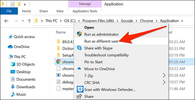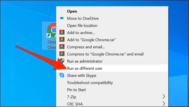 จากนั้นหากทางลัดของแอปของคุณอยู่ในเดสก์ท็อปของคุณคลิกขวาที่ทางลัดแล้วเลือก "เรียกใช้เป็นผู้ใช้ที่แตกต่างกัน"