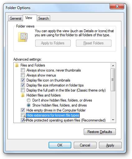 เลือกไฟล์ ดู และยกเลิกการเลือกช่องด้านข้าง ซ่อนนามสกุลสำหรับชนิดแฟ้มที่รู้จัก . ตอนนี้คลิก ตกลง เพื่อบันทึกการเปลี่ยนแปลงจากนั้นเปลี่ยนนามสกุลไฟล์ของคุณเหมือนเดิม