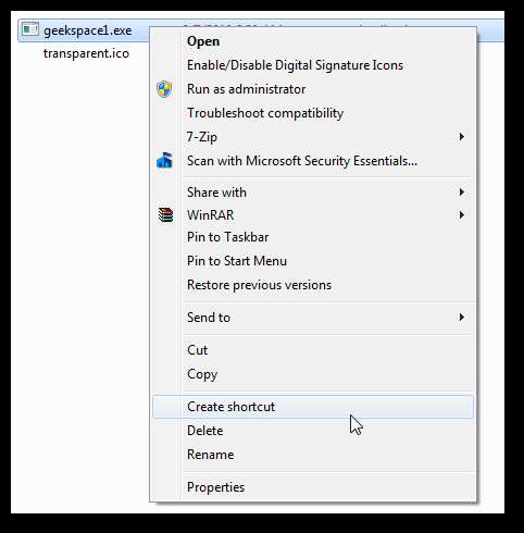 ตอนนี้เราสามารถตรึงแอปพลิเคชันปลอมนี้ไว้ที่ทาสก์บาร์ได้ แต่นั่นก็ไม่ได้ผลดีอะไรกับเรามากนักเนื่องจากมีไอคอนแอปพลิเคชันเริ่มต้นและจะไม่ค่อยดีในการแยกโปรแกรม แต่เราจะสร้างทางลัดไปยังแอปนี้ด้วยไอคอนโปร่งใส คลิกขวาที่แอปพลิเคชันใหม่ของคุณแล้วเลือก สร้างทางลัด .