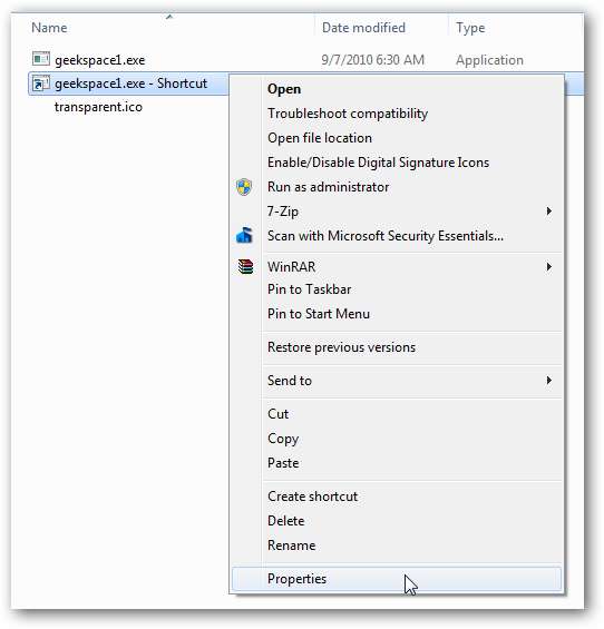 ตอนนี้เราต้องการเปลี่ยนไอคอนบนทางลัดเป็นไอคอนโปร่งใสเพื่อให้เรามีช่องว่างที่ชัดเจนในแถบงานเพื่อแยกโปรแกรมต่างๆ ก่อนอื่นคุณต้องมีไฟล์ไอคอนโปร่งใส คุณสามารถสร้างของคุณเองหรือดาวน์โหลดที่เราสร้างขึ้นจากลิงค์ด้านล่าง จากนั้นหากต้องการเปลี่ยนไอคอนทางลัดให้คลิกขวาที่ทางลัดแล้วเลือก คุณสมบัติ .