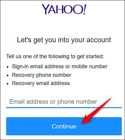 ป้อนที่อยู่อีเมล Yahoo หรือหมายเลขโทรศัพท์ที่คุณใช้ในการสมัครจากนั้นคลิกปุ่ม "ดำเนินการต่อ" หากคุณใช้ที่อยู่อีเมลคุณจะได้รับข้อความพร้อมลิงก์ที่คุณสามารถคลิกเพื่อสร้างรหัสผ่านใหม่ หากคุณใช้หมายเลขโทรศัพท์มีขั้นตอนเพิ่มเติมอีกสองสามขั้นตอนก่อนที่คุณจะไปถึงส่วนนั้นและเราจะตรวจสอบข้อมูลเหล่านั้นให้ละเอียดยิ่งขึ้นที่นี่