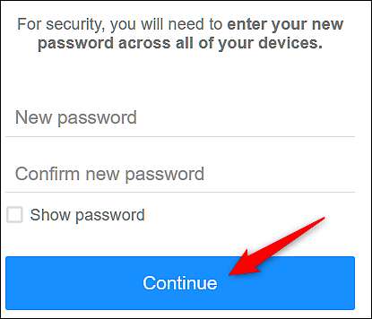 หน้าจอถัดไปกำหนดให้คุณต้องสร้างรหัสผ่านใหม่สำหรับบัญชีของคุณ (อย่าลืม ใช้รหัสผ่านที่คาดเดายาก ). หลังจากพิมพ์และยืนยันรหัสผ่านใหม่ของคุณแล้วให้คลิกปุ่ม“ ดำเนินการต่อ”
