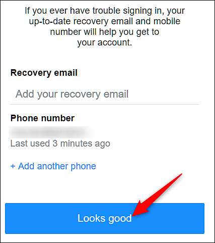 สุดท้ายหากคุณไม่มีบัญชีสำรองอื่น ๆ ที่เชื่อมโยงกับบัญชีของคุณคุณจะได้รับแจ้งให้เพิ่มอีเมลสำรองหรือหมายเลขโทรศัพท์ นี่เป็นเพียงในกรณีที่คุณไม่สามารถเข้าถึงอีเมลหลักหรือหมายเลขโทรศัพท์ของคุณและจำเป็นต้องกู้คืนรหัสผ่านอีกครั้งในอนาคต หลังจากที่คุณเพิ่มข้อมูลแล้วให้คลิกปุ่ม“ ดูดี”