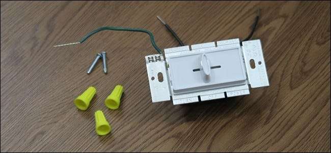 สวิตช์หรี่ไฟของคุณจะมาพร้อมกับน็อตลวดและสกรูสองตัว ตัวสวิตช์จะมีสายสีดำสองเส้นและสายสีเขียว (กราวด์) หนึ่งเส้น ณ จุดนี้เป็นเพียงการจับคู่สายไฟระหว่างสวิตช์และกล่องรวมสัญญาณแล้วเดินสาย