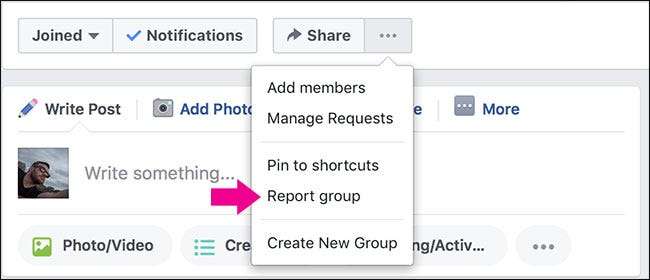 ไปที่กลุ่มที่กระทำผิดและคลิกที่จุดสามจุด คุณไม่จำเป็นต้องเป็นสมาชิกเพื่อดูพวกเขา